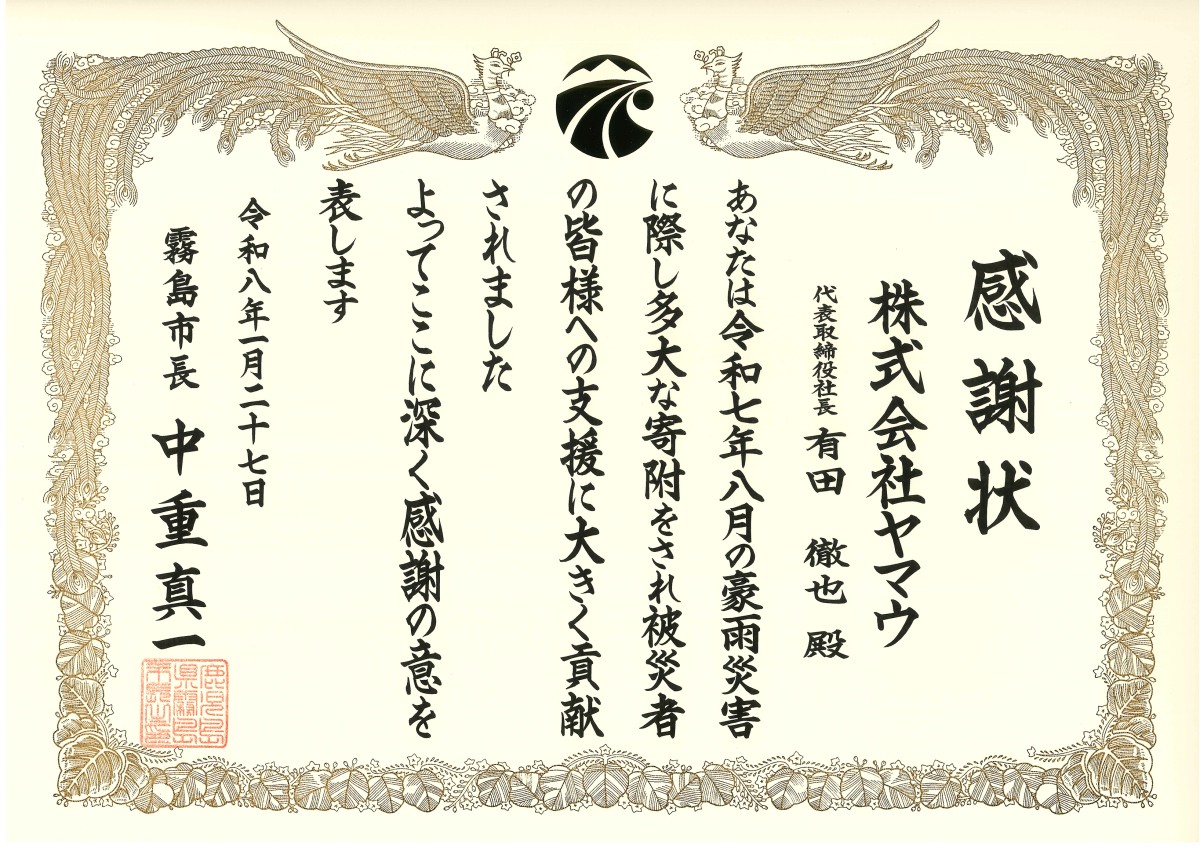 お知らせ TOP お知らせ ニュースリリース 霧島市より感謝状を受贈しました 霧島市より感謝状を受贈しました NEW 2026.02.06 霧島市の「令和7年8月豪雨災害による復旧・復興支援事業」に企業版ふるさと納税として寄付を行ったことに対し、2026年1月27日に霧島市より感謝状を受贈しました。
