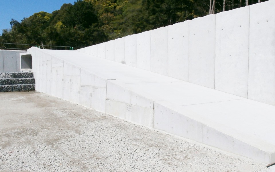たて壁を工場製作し、底板とコーナー部を現場打ちしたハーフプレキャストで構成した調整池です。