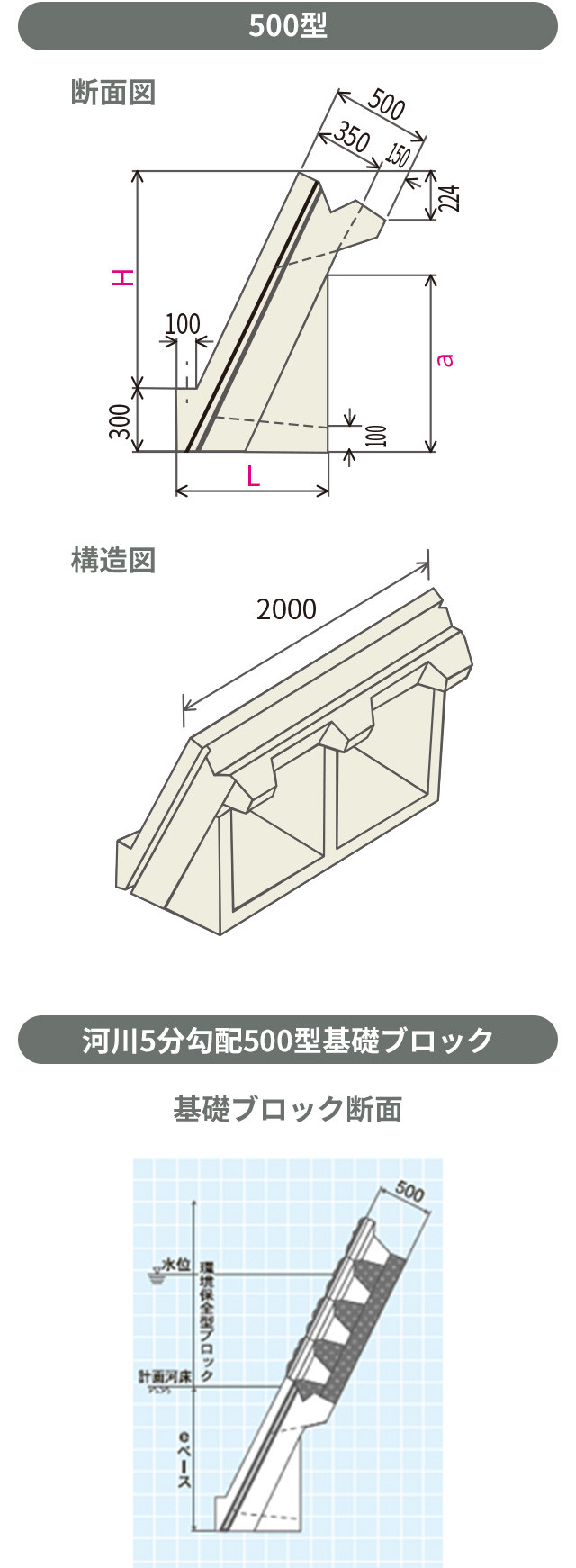 PICK UP製品情報 TOP PICK UP製品情報 eベース eベース 特 長 根入れブロックを兼用した基礎ブロックであるため施工期間が大幅に短縮でき、経済的です。 水替工が削減でき、完全なドライ施工でなくても据付できます。 仮締め切り期間が短く濁水の処理問題を回避し、河川の生態環境へのダメージが少なくなります。 従来工法に比べて、地盤支持力の大幅な低減が可能です。 根入れ深さに応じてH1000、H700、H500の3タイプを揃えています。 350型/500型/2割型